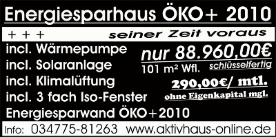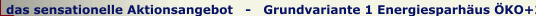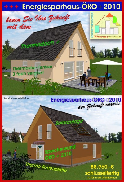 Das gezeigte Energiesparhaus ÖKO+2010 zeigt die Grundvariante. Im Aktionspreis enthalten ist das Technikpaket 1 , sowie die Thermomodul- Ausstattung ÖKO+2010 Standard. Sie müssen lediglich die Maler/ Fußbodenbelagsarbeiten selbst ausführen und mit uns Ihre Thermobodenplatte abstimmen und herstellen.
