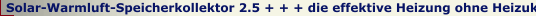 Der Solar-Warmluft-Speicherkollektor 2.5 verbindet effektive Energienutzung mit effektiver Speicherung in einem Gerät. Sein spezieller Aufbau schafft große Absorberflächen und ermöglicht eine Wärmespeicherung bereits im Kollektor zur Nutzung der Restwärme auch nach Sonnenuntergang im Umluftbetrieb.