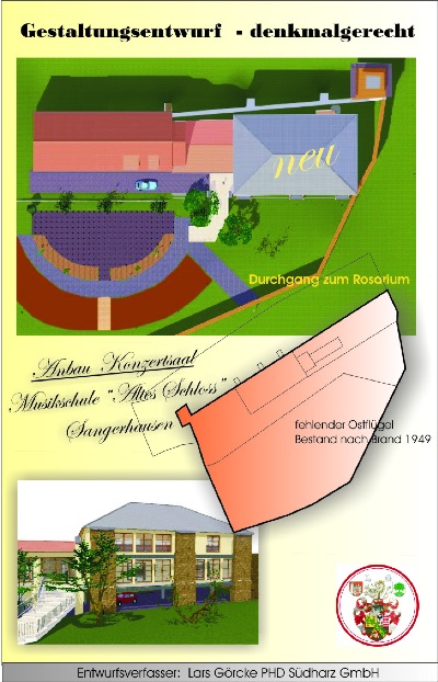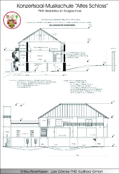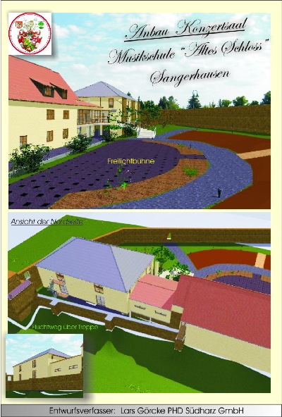 Gestaltungsentwurf des Konzertsaal-Neubau, der Kreismusikschule LK Mansfeld Südharz im "Alten Schloss" unter Berücksichtigung denkmalrechtlicher Gesichtspunkte als funktioneller Bau in Thermomodul-Systembauweise als "schwebender Raum" . Die Anforderungen an den Standort, als auch die Bemühungen an den optimalen Raumklang wurden in besonderer Weise berücksichtigt. Als innovative Bauweise kann hier die Anwendung des konstruktiven Holzbaus im Konzertsaalbau, sowie die Bauweise als vollkommen schwebender Bau bezeichnet werden. Der Baukörper selbst funktioniert als Resorptionskorpus und die Verwendung schwerer Holzarten im Arkustikausbau in Kombination des geplanten variablen Raumsystems und optimierten Flächenbezugsgestaltung (Neigung, Größe, Schallwiederstand, Struktur) , sowie die Raumstruktur des Saales in drei gegleiderte Ebenen, weisen einmalige Besonderheiten auf. Dieses Projekt ist eine Innovation und wurde bisher in keinem bekannten Projekt unter diesen spezifischen Gestaltungsparametern angewendet. Die Konstruktion und Konzeption ist vollkommen neu und innovativ in Bezug auf die Flexibilität des Gesamtkonzeptes Bau gem. der gestellten Anforderungen.