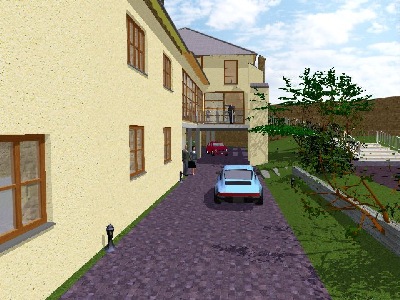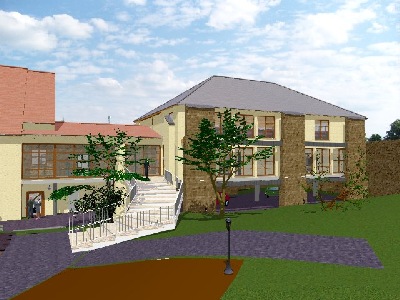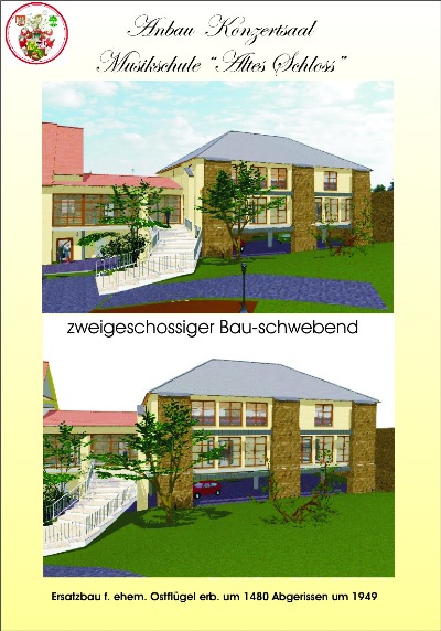 Der Haupteingang der Musikschule. Im Hintergrund der an den historisch erhaltenen Gebäudekörper des Alten Schlosses anschließende Konzertsaalneubau mit der über den Verkehrsflächen schwebenden Außengalerie des Saales. Die somit erhaltenen Verkehrsflächen können zukünftig bei Freiveranstaltungen als Sondernutzungsflächen , insbesondere bei schlechtem Wetter genutzt werden. Die sowieso sehr begrenzten PKW-Stellplatzmöglichkeiten bleiben so fast vollständig erhalten. Rettungswege sind hierdurch im gesamten Nutzungsbereich des Betsandes, sowie des Saalneubaus in Richtung Hauptzugang gut gesichert.