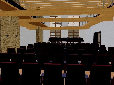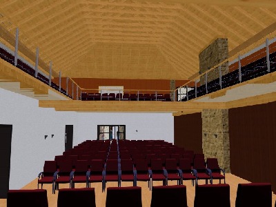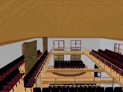 Der Saal mit den drei Ebenen. Parkett, Galerie mit Rang und der speziell erhöhe Dachraum zur Unterstützung der Raumakustik. Der Blick von der Bühne in den Rang zeigt die abgestimmte Dimmensionierung der Raumebenen. Als konstruktiver und frei schwebender Holzbau ,ist dieser Konzertsaal einmalig in seiner Gestaltung. Die ausgerichteten Reflexionsfläche des Dachraums unterstützt die Schallentwicklung mittlerer und langer Frequenzen (mittlerer und tiefer Töne). Die Akustig besitzt einen optimalen Nachhall . Die seitlich erkennbaren dunklen Wandflächen, werden als bewegliche Wandelemente ausgebildet, so das der Parkettraum den entsprechenden Klangvolumen der Orchesterbesetzung optimal angepasst werden kann. Die Ebenenstruktur , sowie die Lufträume zwischen den Ebenen sind so gestaltet, das eine gezielte Tondiffusität erreicht wird. Durch die Verwendung von Deckensegeln die seitlich zwischen den Pfeilern unter der Decke versenkt werden können, können zieggerichtet Teile des Luftraumes unterbrochen und Streuflächen zusätzlich eingesetzt werden. Dies ist insbesondere bei großer Besetzung des Orchesters und nur teilweiser Besetzung der Zuschauerplätze vorteilhaft. Die über dem Orchesterraum liegende kurze Empore unterstützt die Reflexion hoher Töne und bewirkz so ein sehr klares Klangbild bis in die hinteren Ränge. Auch Solisten haben hier einen großen Auftritt.