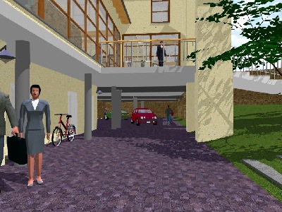Aus der Vogelperspektive wird das Gestaltungskonzept in der Auslegung der Pfeiler als Bauwerksfragmente erkennbar. Durch die frei vor der Fassade stehenden Pfeiler wird eine deutliche Gliederung der Ansicht erreicht. Das Gebäude wird durch die Pfeiler gegründet und schwebt vollständig über den Verkehrsflächen7 Freiflächen des Erdgeschosses. Die Verkehrsflächen bleiben erhalten.