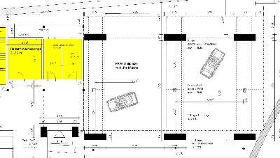 Hier die Grundrissdarstellung der Erdgeschossebene. Die Verkehrsflächen bleiben als offene nicht umbaute Flächen unterhalb des Baukörpers erhalten. Der gesamte Baukörper wird über die hier schwarz dargestellten Pfeiler gegründet.
