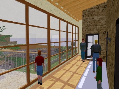 Der Zugang zum Neubau des Konzertsaales ist auch über das Treppenhaus der Musikschule erreichbar. Über einen Zwischenbau im EG auch im Bestand vorhanden, werden die Gebäude miteinander verbunden. Die Galerie im OG des Zwischenbaus nimmt auch die Garderobe und Toiletten auf, die bei Veranstaltungen genutzt werden. Von hieraus hat man einen grandiosen Blick auf die Freiflächen mit dem Amphitheater. Hier kommt das Konzept des offenen Raumes, der die Umgebung gegenseitig einbezieht gut zur Geltung. Leicht und offen wirkt dadurch die gesamte Gebäudestruktur. Der innen liegende und durch die Galerien umschlossene Saal wirkt nicht als massiger Baukörper.